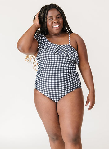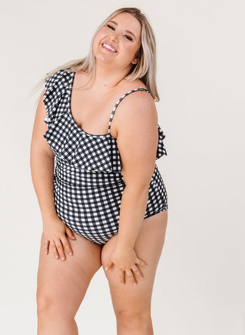 Featuring our classic black & white gingham, this suit is sure to become your favorite! An adjustable strap on one side helps you get a customized fit, and of course, the asymmetrical ruffle is our favorite part and we think you'll love it too!