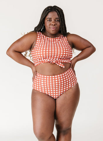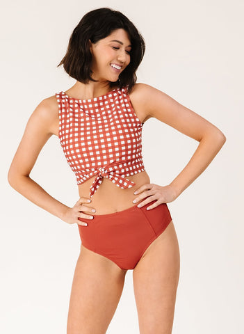This is our favorite suit of the collection and we are certain it will be yours too! In our signature Knotted Crop style, this rust gingham top features a boat-neckline and a knotted detail in the front. This is a style you have come to know & love and will continue for seasons to come.