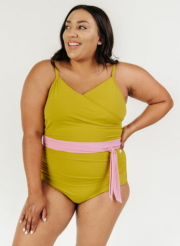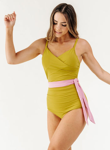 We can't get enough of this chartreuse suit and know you'll feel the same way! Featuring a wrap front & adjustable straps, this suit offers a customizable support system.